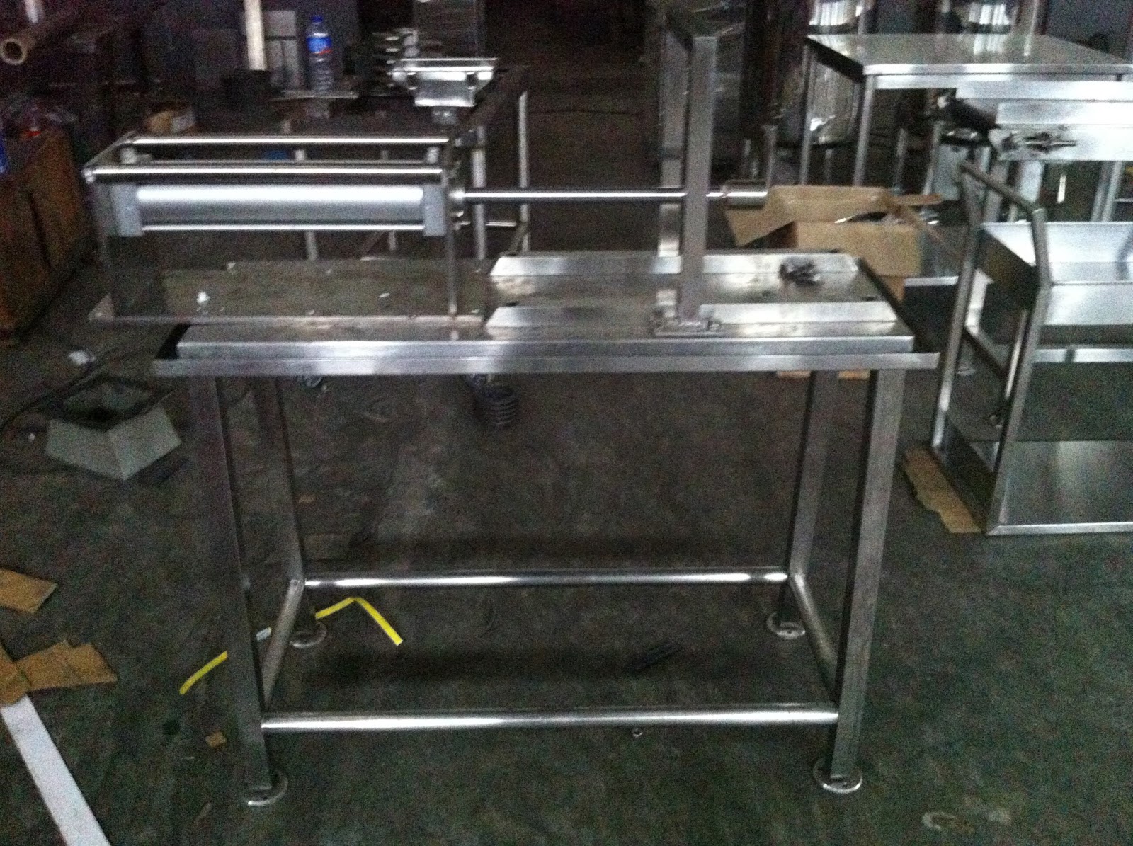 - Kontruksi meja : menggunakan bahan SS304 tebal 1.5mm + penguat. coba anda lihat pada ujung tekukan meja, dibuat seperti itu agar mudah untuk peorses pencucian agar saat di cuci airnya tidak akan jatuh kemana mana melainkan masuk ke saluran tersebut makanya dibuat seperti got.