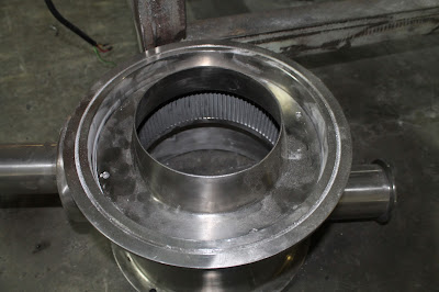 menggunakan amterial SS316L dengan ukuran diamter 300 mm x 320 mm. Sisi sebelah kanan terdapat pipa screw untuk memasukan bahan kedalam rumah penghancur, kemudian Sisi bagian kiri terdapat pipa outpur produk
